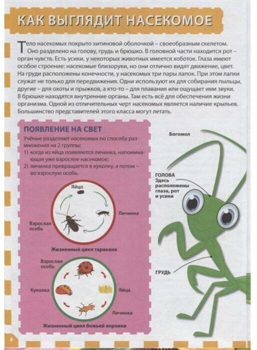 Давай отправимся в увлекательное путешествие по нашей планете, отыскивая и разглядывая самых разных насекомых! Они окружают тебя дома и во дворе, в саду и в парке, на поле и в лесу. Из этой красочной энциклопедии ты узнаешь, какую пользу или вред они приносят, чем питаются и где живут, познакомишься с необычными обитателями джунглей и пустынь и даже побываешь в Антарктиде.
