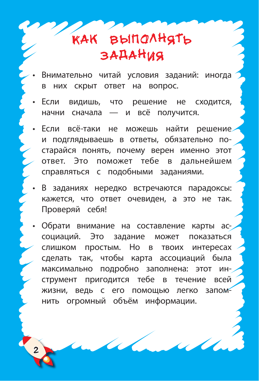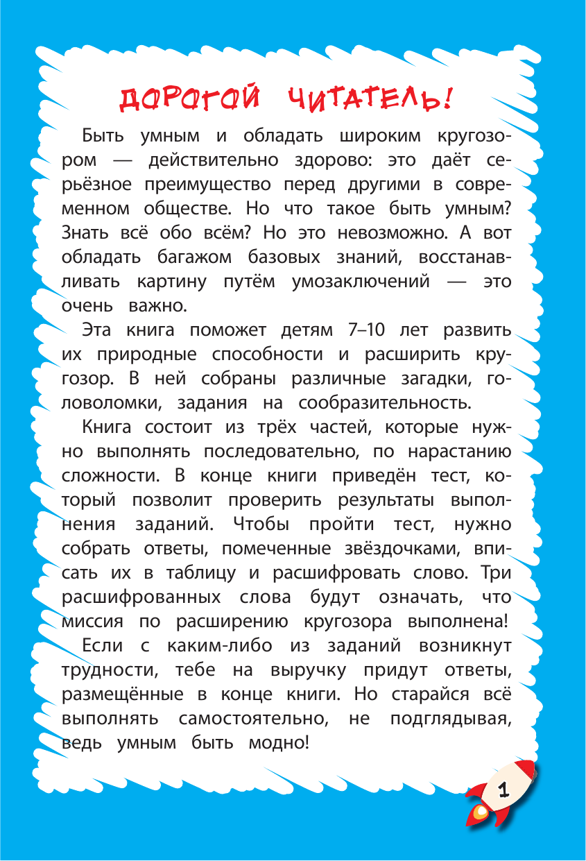 Главная задача интерактивного пособия, предназначенного для самостоятельной работы детей 7—10 лет, — расширить их кругозор и развить познавательные способности. В книге представлены занимательные упражнения по русскому языку и математике, лабиринты, кроссворды, анаграммы, ребусы, викторины и игры, которые помогут развитию кругозора ребёнка. Каждая страница включает одно-два задания, представленного в игровой форме. Они разбиты по сложности на три раздела. В конце книги имеются ответы, которыми можно воспользоваться в случае необходимости.