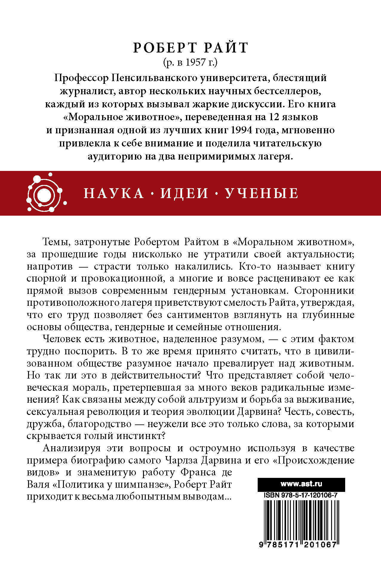 Анализируя эти вопросы и остроумно используя в качестве примера биографию самого Чарлза Дарвина и его «Происхождение видов» и знаменитую работу Франса де Валя «Политика у шимпанзе», Роберт Райт приходит к весьма любопытным выводам...
