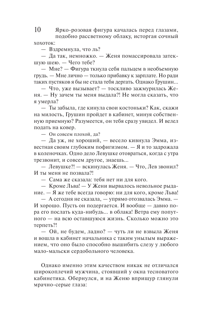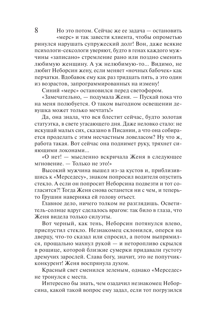 Первый роман - традиционный женский детектив с одинокой девушкой в качестве ГГ, которая работает в частном агенстве. По ходу дела она вылетает в командировку и там находит ее, свою единственную и неповторимую любовь. После чего возлюбленный ее неоднократно спасает и, и вместе с руководителем агенства они раскрывают преступление. Эмоций море.