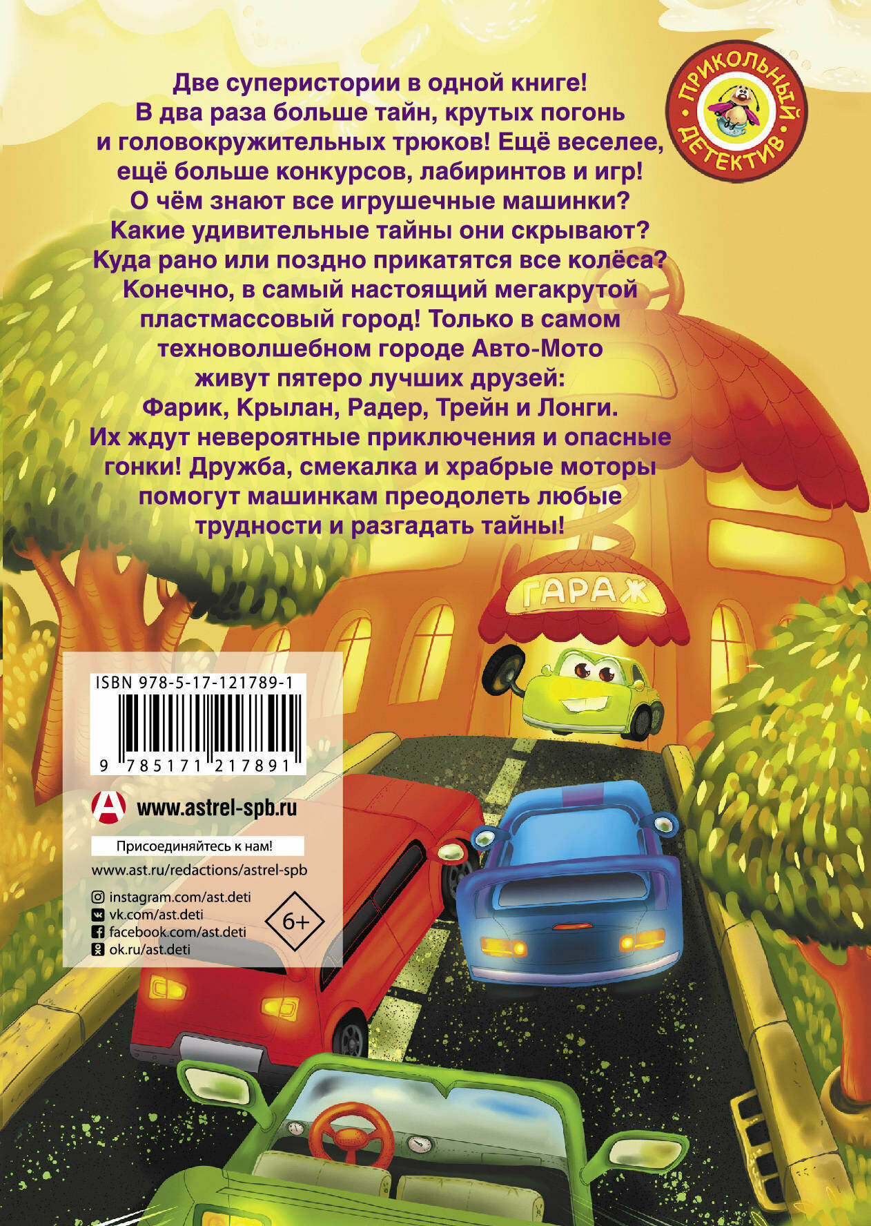 Две суперистории в одной книге! В два раза больше тайн, крутых погонь и головокружительных трюков! Ещё веселее, ещё больше конкурсов, лабиринтов и игр!О чём знают все игрушечные машинки? Какие удивительные тайны они скрывают? Куда рано или поздно прикатятся все колёса? Конечно, в самый настоящий мегакрутой пластмассовый город! Только в самом техноволшебном городе Авто-Мото живут пятеро лучших друзей: Фарик, Крылан, Радер, Трейн и Лонги. У каждого свой неповторимый характер и весёлый нрав.Их ждут невероятные приключения и опасные гонки! Дружба, смекалка и храбрые моторы помогут машинкам преодолеть трудности и разгадать тайны!
