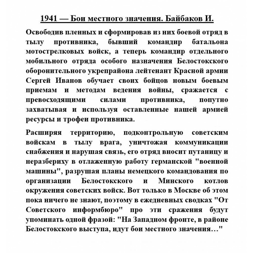 Расширяя территорию, подконтрольную cоветским войскам в тылу врага, уничтожая коммуникации снабжения и нарушая связь, его отряд вносит путаницу и неразбериху в отлаженную работу германской «военной машины», разрушая планы немецкого командования по организации Белостокского и Минского котлов окружения cоветских войск. Вот только в Москве об этом пока ничего не знают, поэтому в ежедневных сводках «От Советского информбюро» про эти сражения будут упоминать одной фразой: «На Западном фронте, в районе Белостокского выступа, идут бои местного значения…»