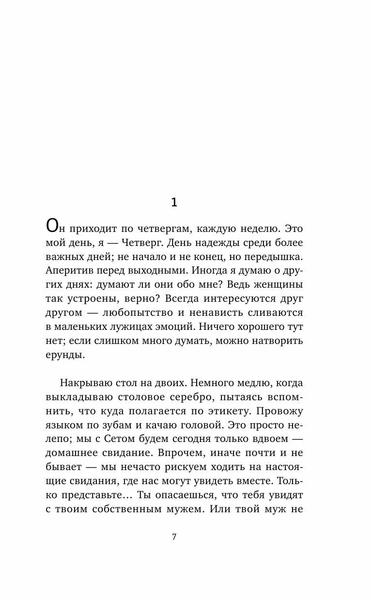 У главной героини триллера экзотическое имя – Четверг – и непростая жизнь. Она очень любит своего мужа, но видится с ним, по иронии судьбы, только… по четвергам. Остальные дни Сет проводит с двумя другими своими женами, которых Четверг никогда не видела и ничего о них не знает.