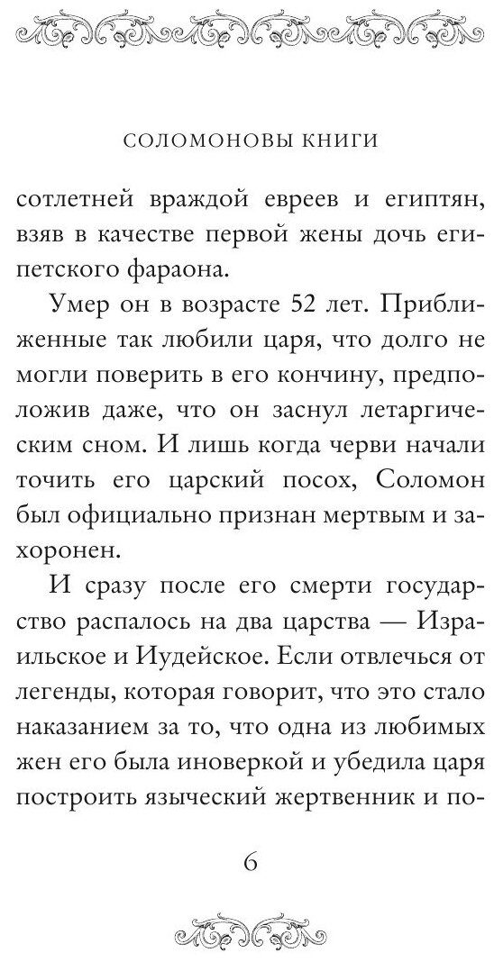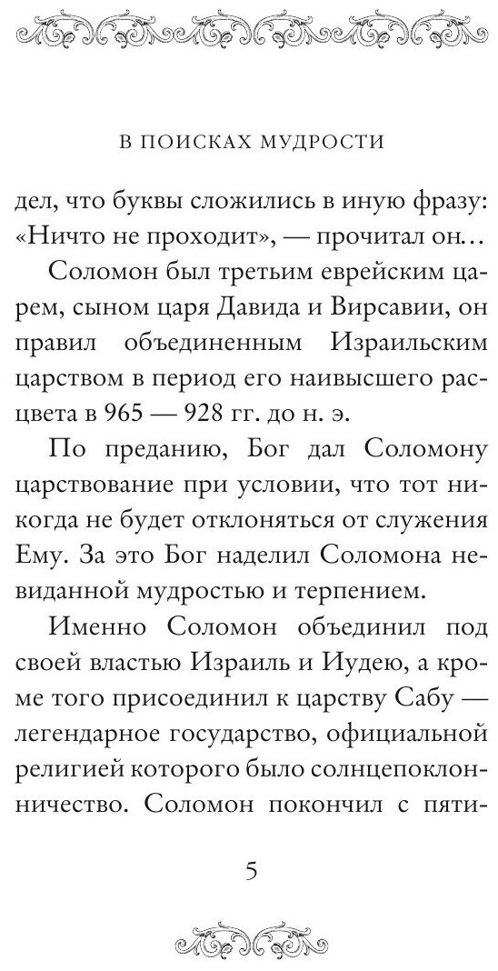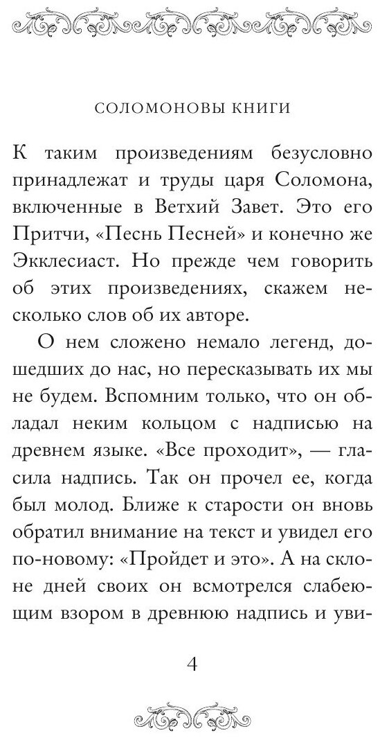 В сборнике представлены три вершинных произведения мировой культуры, оказавших и продолжающих оказывать глубокое влияние на последующее развитие человеческой мысли. "Книга Экклесиаста, или Проповедника", "Книга Песни Песней Соломона" и "Книга Притч Соломона" вошли в плоть и сознание многих народов и культур, знакомых с Ветхим Заветом.