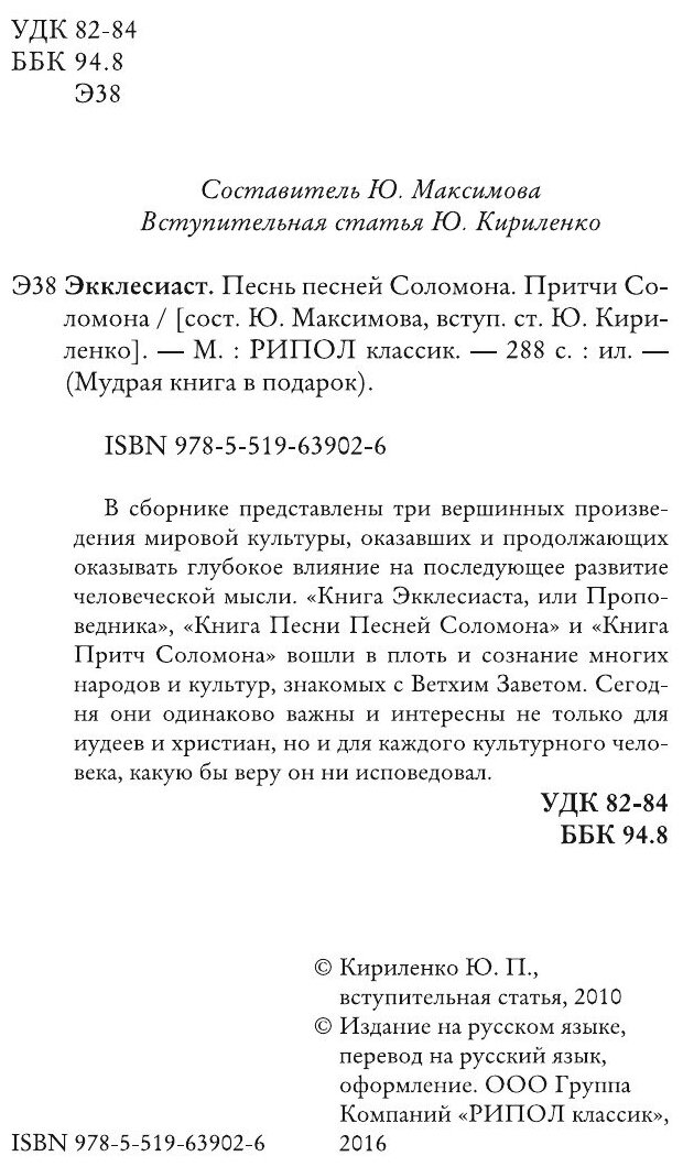 Сервис сравнения цен СкидкаГИД предлагает сравнить цены на товар «Книга: Экклесиаст. Песнь песней Соломона. Притчи Соломона (Максимова Юлия Николаевна), 2020»