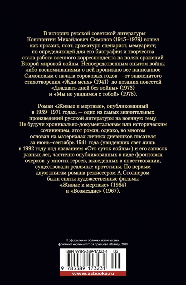 В историю русской советской литературы Константин Михайлович Симонов (1915-1979) вошел как прозаик, поэт, драматург, сценарист, мемуарист; но определяющей для его биографии и творчества стала работа военного корреспондента на полях сражений Второй мировой войны. Непосредственным опытом войны либо воспоминаниями о ней пронизано все написанное Симоновым с начала сороковых годов - от знаменитого стихотворения "Жди меня" (1941) до поздних повестей "Двадцать дней без войны" (1973) и "Мы не увидимся с тобой" (1978). Роман "Живые и мертвые", опубликованный в 1959-1971 годах, - одно из самых значительных произведений русской литературы на военную тему. Не будучи хроникально-документальным или историческим сочинением, этот роман, однако, во многом основан на материалах личных дневников писателя за июнь-сентябрь 1941 года (увидевших свет лишь в 1992 году под названием "Сто суток войны") и его записок разных лет, частично опубликованных в виде фронтовых очерков; у многих героев, выведенных в повествовании, существовали реальные прототипы. По первым двум книгам романа режиссером А. Столпером были сняты художественные фильмы "Живые и мертвые" (1964) и "Возмездие" (1967).