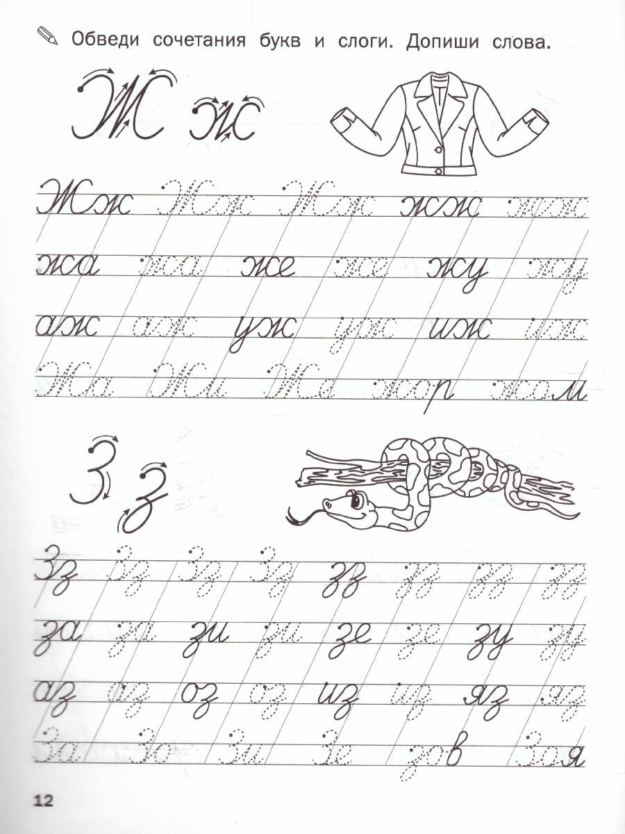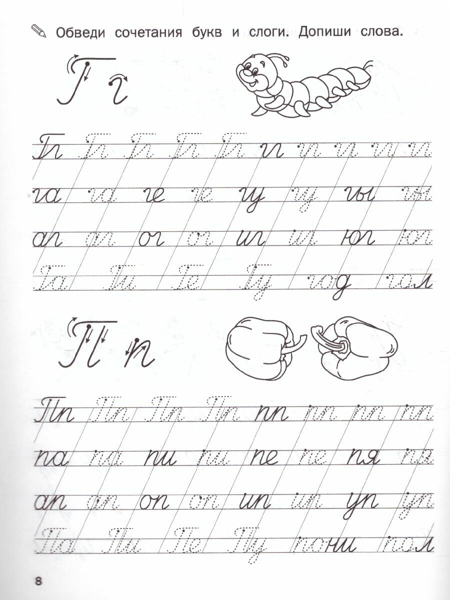 Прописи подойдут для тех детей, кто уже освоил написание отдельных букв и переходит к тренировке их соединения. В прописях предлагается сначала обвести букву по точкам, а затем обвести разные слоги с этой буквой. Место для самостоятельного прописывания соединений букв не предусмотрено. Листы средней плотности, ручку не просвечивают. Также на каждую букву нарисована небольшая черно-белая картинка для раскрашивания.