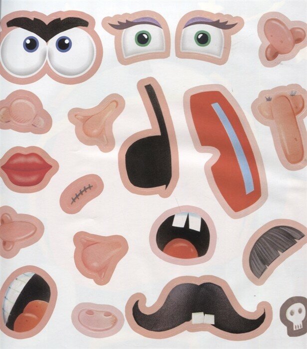 Подбери наклейки, подходящие принцессе, пирату, космонавту и другим персонажам книги, а потом перемешай их, чтобы получилось ещё больше забавных мордашек!