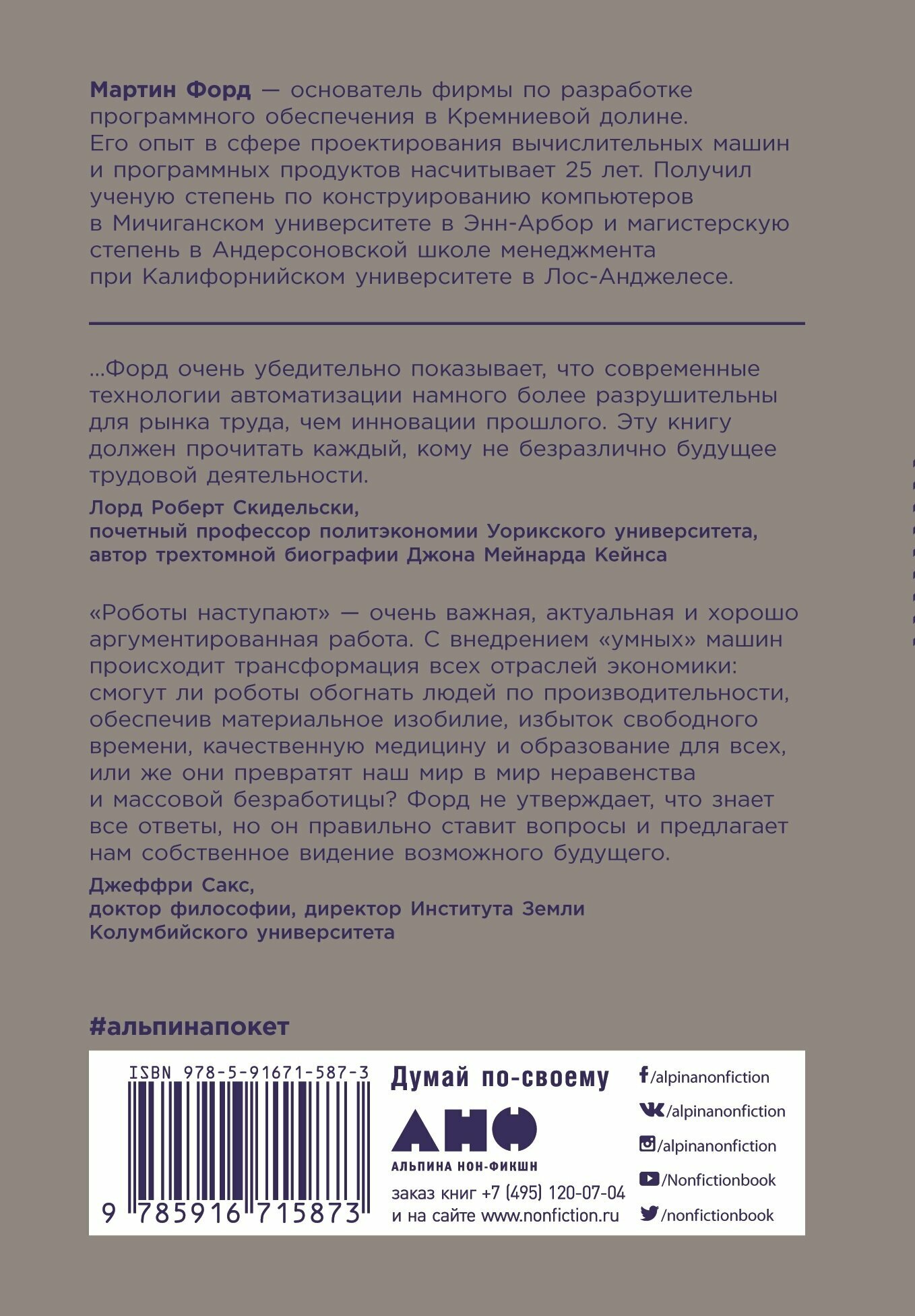 Смогут ли роботы обеспечить людям материальное изобилие, избыток свободного времени, качественную медицину и образование или же они превратят наш мир в мир неравенства и массовой безработицы? Правда ли, что усердие и талант перестанут быть залогом жизненных достижений? Успешный разработчик программ и IT-предприниматель Мартин Форд не претендует на то, что знает ответы на все вопросы, но аргументированно и веско показывает, почему современные технологии способны оказаться намного более разрушительными для рынка труда, чем инновации прошлого. Цель автора - не испугать читателя, а привлечь внимание к этим непростым темам. Эту увлекательную и содержательную книгу стоит прочитать всем, кто хочет понять, как развитие новых технологий влияет на экономические перспективы, на наших детей и на общество в целом.