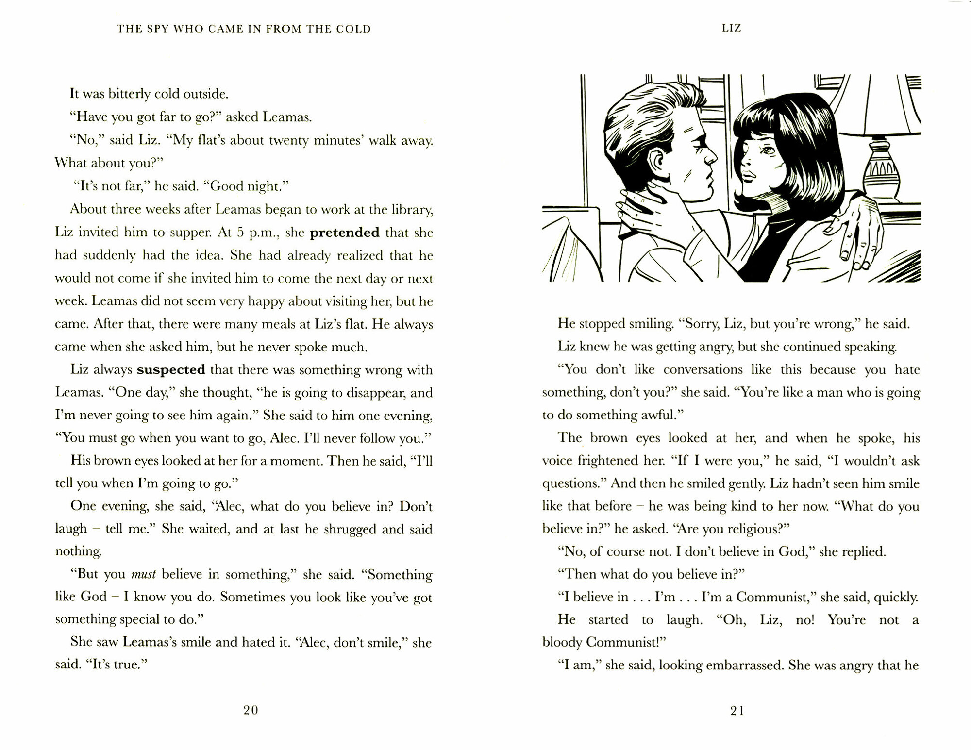 The Spy Who Came in from the Cold, a Level 6 Reader, is B1+ in the CEFR framework. The longer text is made up of sentences with up to four clauses, introducing future continuous, reported questions, third conditional, was going to and ellipsis. A small number of illustrations support the text.