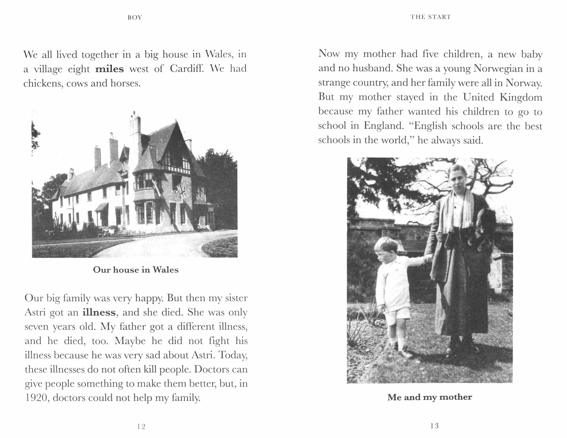 This book is about sweet shops, school days and summer holidays! It is the story of the famous writer Roald Dahl when he was a boy. These tales are exciting, funny and sometimes frightening. All of them are true. Penguin Readers is a series of popular classics, exciting contemporary fiction, and thought-provoking non-fiction written for learners of English as a foreign language. Beautifully illustrated and carefully adapted, the series introduces language learners around the world to the bestselling authors and most compelling content from Penguin Random House.The eight levels of Penguin Readers follow the Common European Framework and include language activities that help readers to develop key skills. Boy, a Level 2 Reader, is A1+ in the CEFR framework. Sentences contain a maximum of two clauses, introducing the future tenses will and going to, present continuous for future meaning, and comparatives and superlatives. It is well supported by illustrations, which appear on most pages.