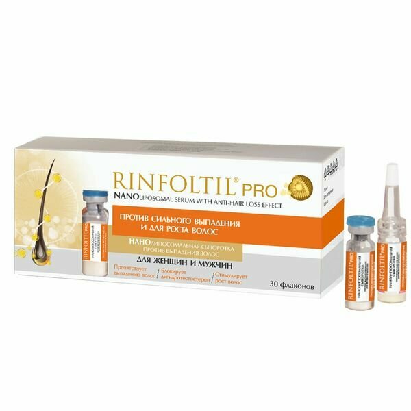 РИНФОЛТИЛ PRO Нанолипосомальная сыворотка против выпадения волос для женщин и мужчин / RINFOLTIL PRO NANOLIPOSOMAL SERUM WITH ANTI-HAIR LOSS EFFECT/. 30 фл. по 160 мг.Профессиональная нанолипосомальная сыворотка против выпадения волос для женщин и мужчин РИНФОЛТИЛ PRO создана на основе последних научных разработок. Нанолипосомы, с заключенными внутрь биологически активными компонентами, легко проходят эпидермальный барьер, проникают в глубокие слои кожи и непосредственно в волосяные фолликулы. Сыворотка работает в трех направлениях: питает кожу головы и корни волос, стимулирует волосяные фолликулы, укрепляет стержни волос. РЕЗУЛЬТАТ: сыворотка останавливает повышенное выпадение волос, активирует волосяные фолликулы, увеличивает продолжительность фазы активного роста волос, восстанавливает объем, эластичность и блеск волос, показана при различных видах алопеции в моно и комплексной терапии. СПОСОБ ПРИМЕНЕНИЯ: применять ежедневно на протяжении 3-х месяцев. Равномерно нанесите сыворотку на проблемные участки кожи головы, массируйте, пока сыворотка не впитается в кожу, не смывайте.Для очищения кожи головы и усиления эффекта рекомендуется использовать шампуни RINFOLTIL. Флакон рассчитан на однократное применение. Наносите 1 раз в день на чистую кожу головы на протяжении 3-х месяцев. Вскройте флакон. Добавьте питьевую воду комнатной температуры до верхнего края этикетки. Наденьте дозатор на флакон. Энергично встряхните флакон до растворения таблетки. Равномерно нанесите сыворотку на проборы и проблемные участки с поредением или отсутствием волос. Массируйте, пока сыворотка не впитается в кожу. Не смывать! Уложите волосы привычным способом. Промойте дозатор под струей воды.Не использовать при индивидуальной непереносимости компонентов сыворотки.