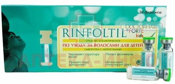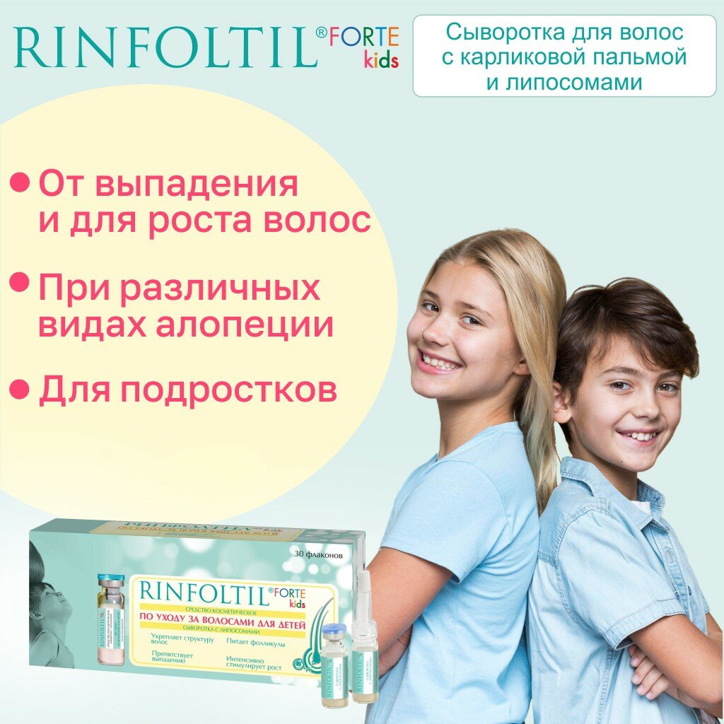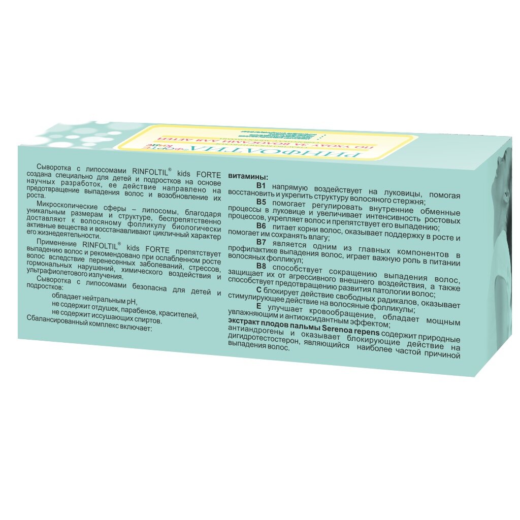 Сыворотка с липосомами RINFOLTIL® kids FORTE создана специально для детей и подростков на основе научных разработок, ее действие направлено на предотвращение выпадения волос и возобновление их роста. Липосомы - это микроскопические сферы размером до 200 нм, оболочка которых состоит из фосфолипидов - основного структурного компонента мембран клеток. Благодаря своей структуре липосомы биосовместимы с липидными слоями мембран и легко сливаются с клетками, что обеспечивает адресную доставку биологически активных компонентов, заключенных внутрь липосом, непосредственно к месту назначения. Благодаря своим размерам и структуре липосомы легко проходят эпидермальный барьер, проникают в глубокие слои кожи и непосредственно в волосяные фолликулы. Сыворотка с липосомами безопасна для детей и подростков: укрепляет структуру волоса; препятствует выпадению; питает фолликулы; интенсивно стимулирует рост. Сбалансированный комплекс включает витамины: В1 напрямую воздействует на луковицы, помогая восстановить и укрепить структуру волосяного стержня; В5 помогает регулировать внутренние обменные процессы в луковице и увеличивает интенсивность ростовых процессов, укрепляет волос и препятствует его выпадению, В6 питает корни волос, оказывает поддержку в росте и помогает им сохранять влагу; В7 является одним из главных компонентов в профилактике выпадения волос, играет важную роль в питании волосяных фолликул; В8 способствует сокращению выпадения волос, защищает их от агрессивного внешнего воздействия, а также способствует предотвращению развития патологии волос. С блокирует действие свободных радикалов, оказывает стимулирующее действие на волосяные фолликулы; Е улучшает кровообращение, обладает мощным увлажняющим и антиоксидантным эффектом; экстракт плодов пальмы Serenoa repens содержит природные антиандрогены и оказывает блокирующие действие на дигидротестостерон - наиболее частую причину выпадения волос. Технология липосомирования - это инновационная форма доставки активных веществ точно в цель, многократно увеличивающая их биодоступность. Нейтральный рН. АО «Вектор-Медика» - производитель лекарственных препаратов, биологически активных добавок и косметики на рынке с 1990 г. Система менеджмента качества АО «Вектор-Медика» соответствует требованиям ISO 9001-2015. Свидетельство о государственной регистрации KG.11.01.09.001.R.005284.12.19 от 10.12.2019. Произведено в сотрудничестве с Pharmalife Research srl (Италия).