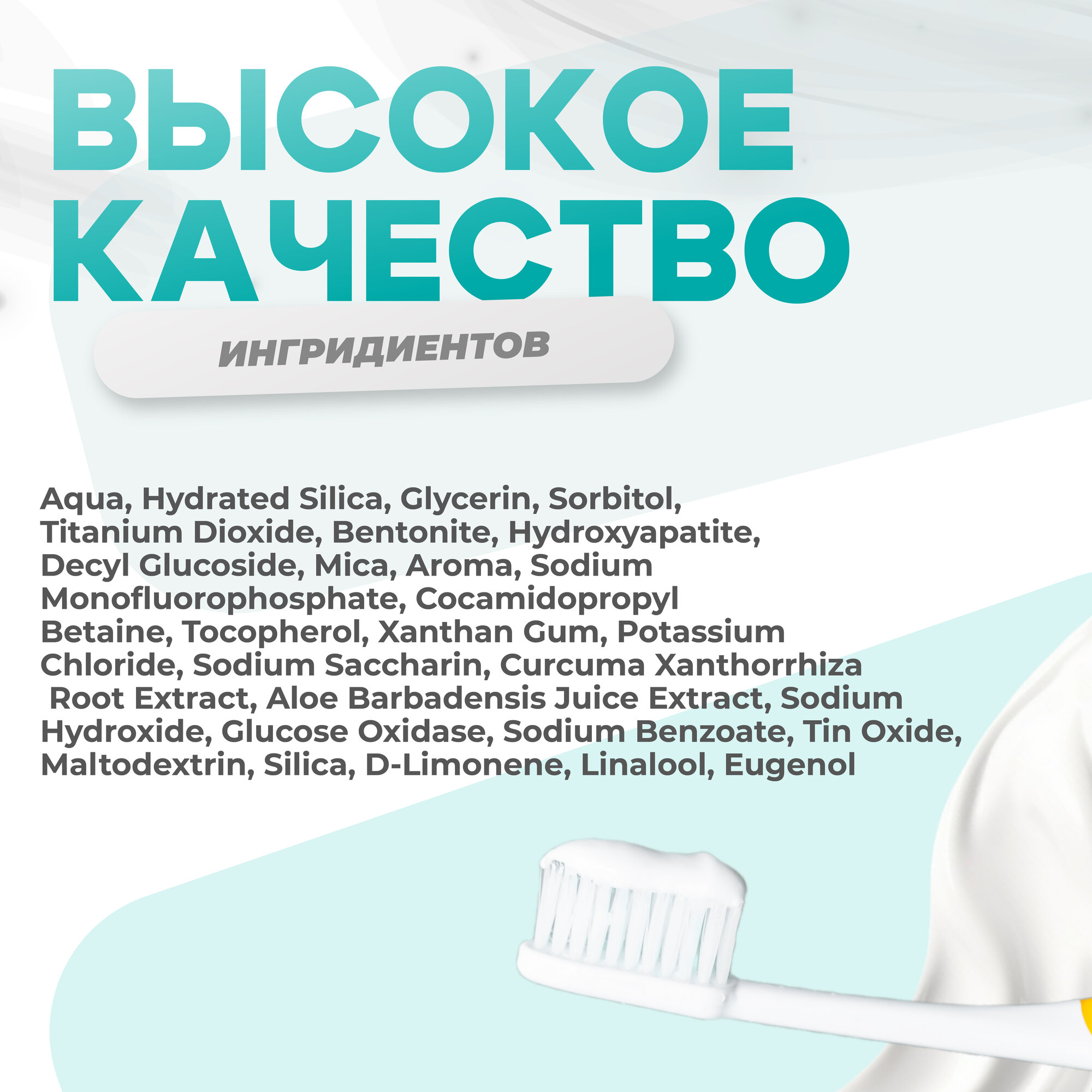 | Состав | aqua; hydrated silica; glycerin; sorbitol; titanium dioxide; bentonite; hydroxyapatite; decyl glucoside; mica; aroma; sodium monofluorophosphate; cocamidopropyl betaine; tocopherol; xanthan gum; potassium chloride; sodium saccharin; curcuma xanthorrhiza root extract; aloe barbadensis juice extract; sodium hydroxide; glucose oxidase; sodium benzoate; tin oxide; maltodextrin; silica; d-limonene; linalool; eugenol |