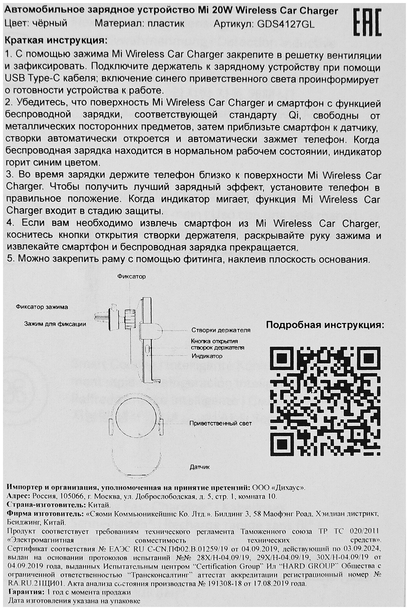 Модель: Mi 20W Wireless Car Charger (GDS4127GL)