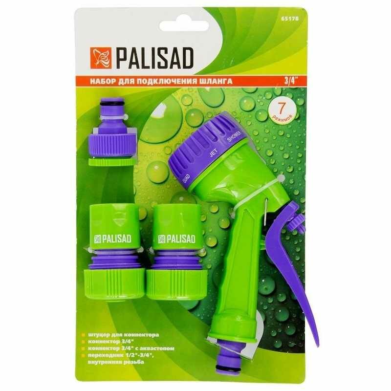 | Прочие особенности и свойства | Набор для подключения шланга диаметром 3/4" Palisad 65178 включает пистолет с 7 режимами разбрызгивания, адаптер и 2 соединителя. Предназначен для организации системы орошения. Коннектор с функцией «аквастоп» останавливает подачу воды при отсутствии соединения с пистолетом. Элементы набора могут использоваться со всеми оросительными системами линеек Palisad и Palisad Luxe. Комплект пригодится для ухода за растениями на дачном участке.,Преимущества,Прочность — все элементы изготовлены из ABS-пластика, устойчивого к повреждениям и не подверженного коррозии.,Простая подготовка к работе — при помощи быстросъемных коннекторов можно мгновенно соединять и рассоединять шланг и распылитель.,Регулируемая форсунка — можно подобрать оптимальный режим полива с учетом типа растительности:душ, полный поток, жесткая струя, туман, мелкий туман, плоско-горизонтальная или плоско-вертикальная струя.,Режим непрерывного полива — курок фиксируется в нажатом положении.,Дополнительные возможности — в набор входит адаптер для соединения поливочной системы с кранами диаметром 1/2 и 3/4". |