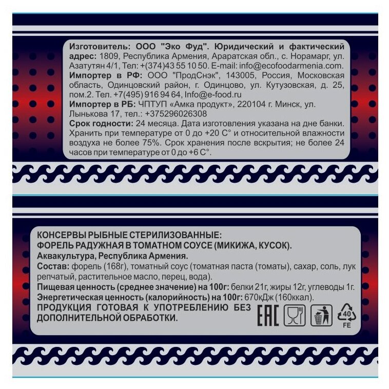 | Состав | форель (форель микижа, аквакультура), томатный соус (томатная паста, сахар, соль, лук репчатый, растительное масло, перец, вода) |