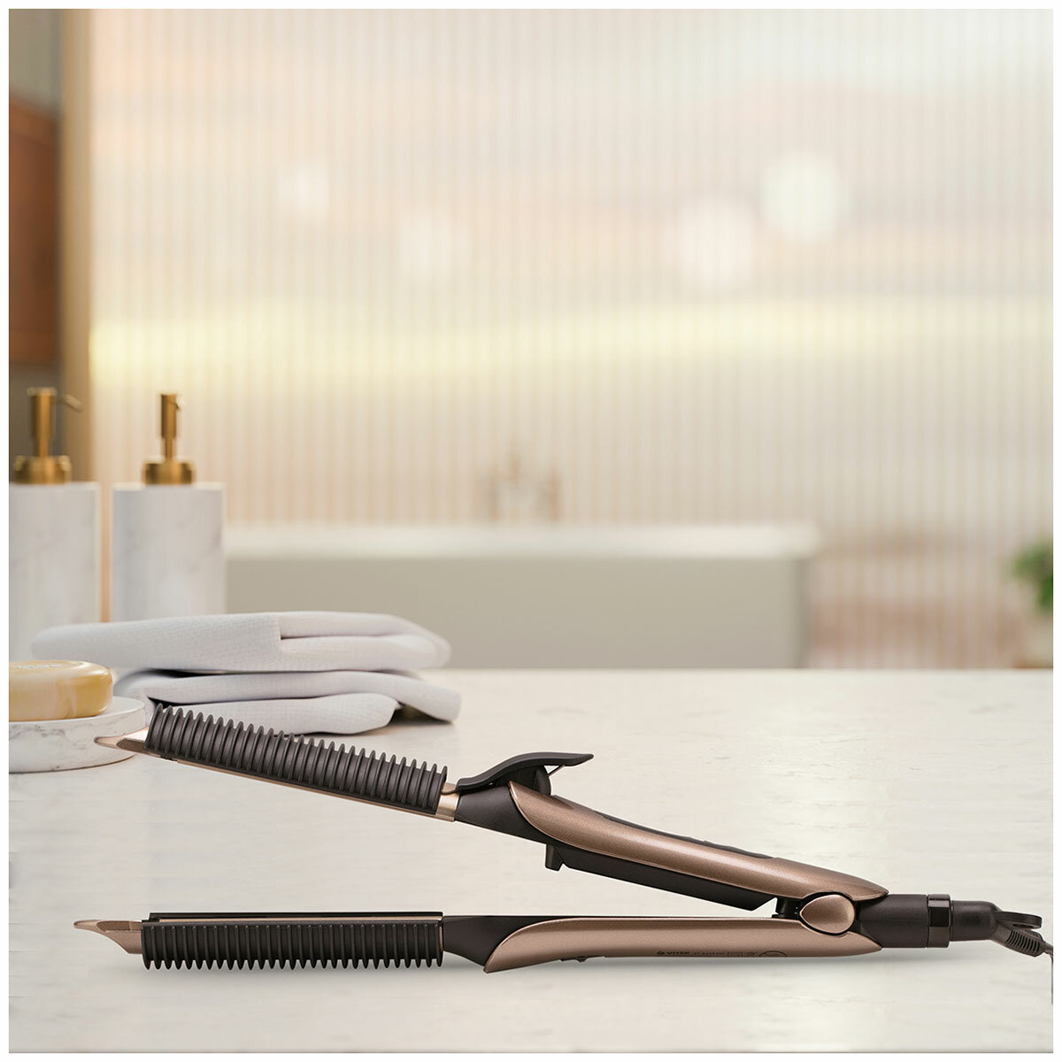 Устройство с габаритами 30х5х3,5 см имеет замок для блокировки щипцов и петлю для подвешивания, что упрощает его хранение. Вращающийся сетевой шнур длиной 1,8 м обеспечивает размещение плойки на комфортном от розетки расстоянии.