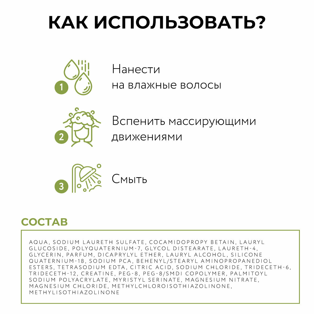 Способ применения: Массирующими движениями нанести на влажные волосы, оставить на 1-2 минуты. Смыть.