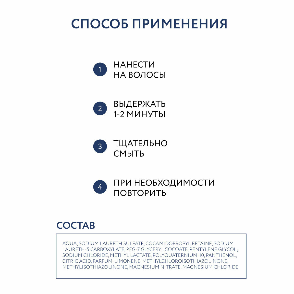 Нанести на волосы, выдержать 1–2 минуты, тщательно смыть. При необходимости повторить.