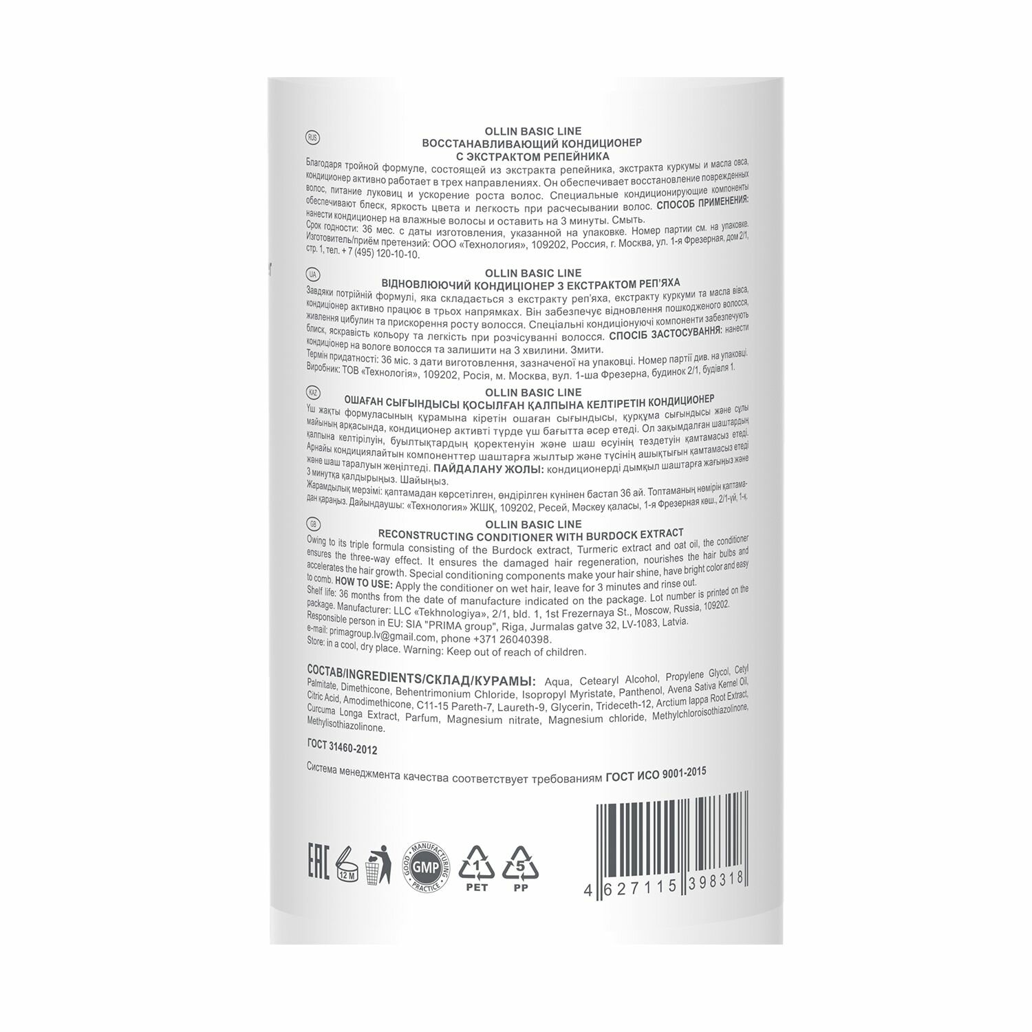 | Состав | water, cetearyl alcohol, behentrimonium chloride, propylene glycol, cetyl palmitate, cyclomethicone, cetrimonium chloride , glycerin, d-panthenol, avena sativa (oat) kernel oil, amodimethicone, c11-c15 pareth-7, laureth-9, trideceth-12, arctium lappa extract, curcuma longa extract, sodium pca, citric acid, fragrance, 5-chlor-2-methyl-4-isothiazolin-3-one, 2-methyl-4-isothiazolin-3-one |