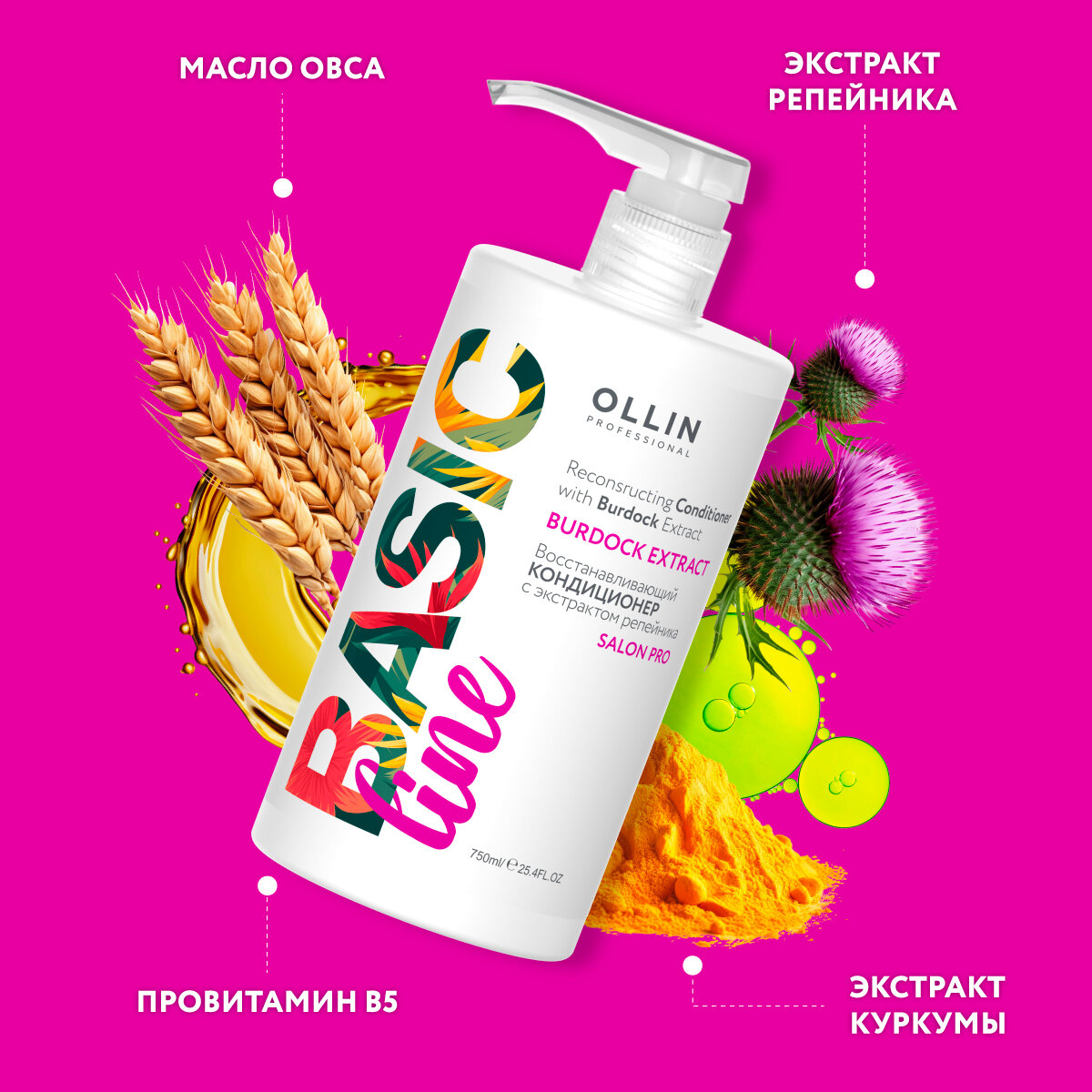 | Полное описание | Кондиционер для волос с экстрактом репейника. Новая профессиональная салонная линия Basic Line от Ollin Professional. Эффективное средство для восстановления, питания и стимуляции активации роста волос.Особенности продукта: • Работает в трех направлениях - восстанавливает поврежденные волосы, питает луковицы и ускоряет рост волос. • Продукт обеспечивает блеск, яркость цвета и легкость расчесывания. • Основа кондиционера - это экстракты репейника, куркумы. • Состав обогащен маслом овса и провитамином B5.• Используйте регулярно после мытья и Вам гарантированы здоровые и красивые волосы.Способ применения: Вымыть голову шампунем с репейник линии Basic Line. • Нанести кондиционер на волосы и применить легкий массаж. • Оставить на некоторое время для воздействия. • Смыть водой.• Специально для профессионального использования в салонах!Объем |
