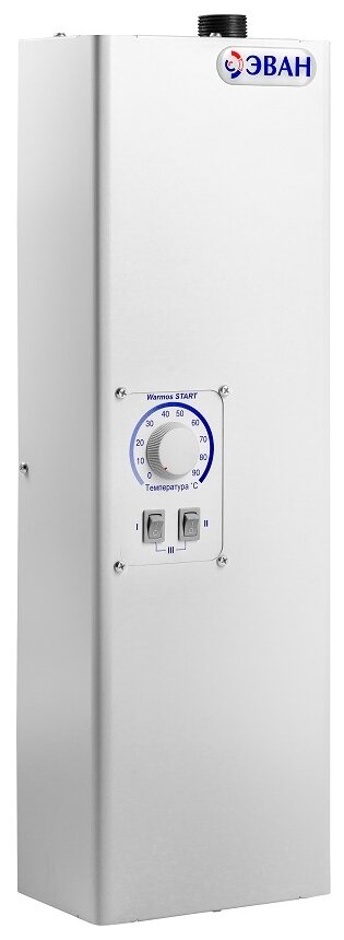 Электрический котел отопления модели Эван Warmos Start – 12 может использоваться в качестве основного отопительного оборудования или стать альтернативным вариантом при наличии твердотопливного или газового котла. Агрегат имеет встроенное термореле, которое автоматически отключает ТЭНы при чрезмерном нагреве теплоносителя, защищая, таким образом, компоненты прибора от перегрева.