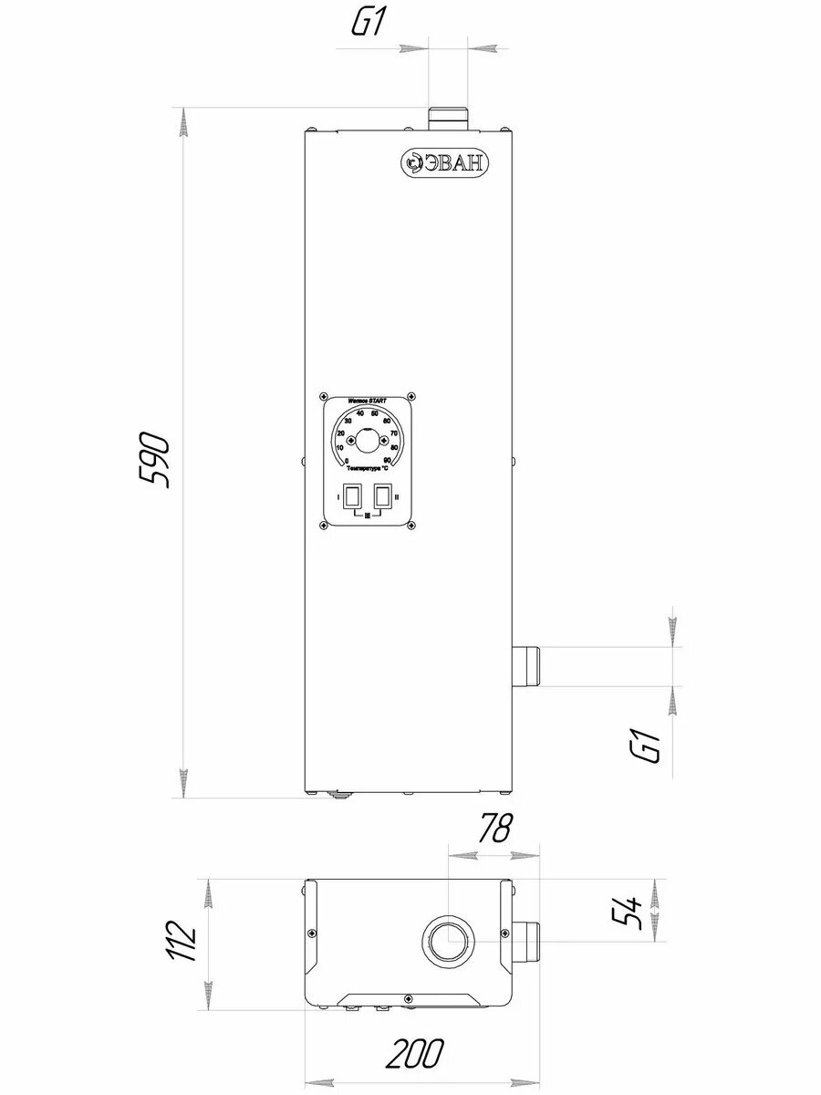Одноконтурный котел отопления Эван Warmos Start – 14 работает на электрической энергии и предусматривает подключение к трехфазной сети электропитания. На передней панели корпуса агрегата установлена удобная панель управления, при помощи которой Вы сможете регулировать температуру теплоносителя в системе. При превышении температуры воды максимально допустимого значения встроенное термореле отключает электронагреватели в автоматическом режиме, предупреждая перегрев котла.