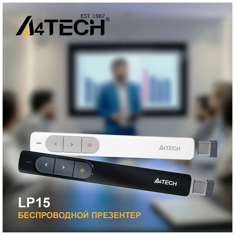 Презентер A4Tech LP15: эффективность и удобство в каждой деталиПрезентер A4Tech LP15 – это современное и функциональное устройство, которое значительно упрощает процесс управления презентациями. Он оснащен тремя кнопками, позволяющими начать, остановить и переключать слайды, что делает управление презентацией быстрым и удобным.Одной из особенностей презентера является наличие лазерной указки. Она позволяет быстро и точно указать на нужный элемент на экране, что особенно полезно при проведении презентаций.Презентер имеет встроенный отсек для хранения ресивера, что обеспечивает удобство использования и предотвращает потерю ресивера.Устройство имеет компактные размеры (202x78x27 мм) и легкий вес (всего 75 грамм), что делает его удобным для переноски и использования.Презентер A4Tech LP15 работает на частоте 2.4 ГГц, что обеспечивает стабильное соединение на расстоянии до 15 метров.Презентер выполнен из качественного пластика и имеет стильный белый цвет, что делает его привлекательным и современным.Презентер A4Tech LP15 совместим с ОС Windows, macOS, Android и iOS, что обеспечивает его широкую совместимость с различными устройствами.Презентер A4Tech LP15 станет незаменимым помощником для всех, кто проводит презентации и хочет сделать их более эффективными и увлекательными.