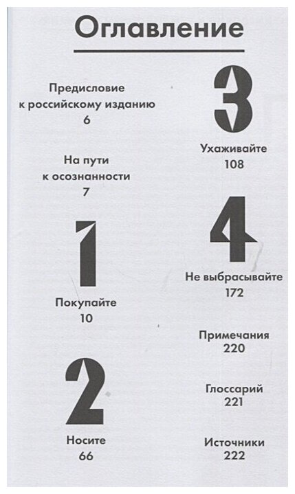 Книга состоит из четырех глав: "Покупка", "Ношение", "Уход" и "Утилизация". Каждая из них содержит всю необходимую информацию с советами и иллюстрированными примерами из практики, которые помогут сделать первый шаг к осознанному гардеробу. В справочном разделе вы найдете подробную информацию об этичных модных коллекциях, экологически чистых тканях, стандартах и сертификатах; методах очистки одежды; возможностях по прокату, обмену и утилизации; и многое другое.