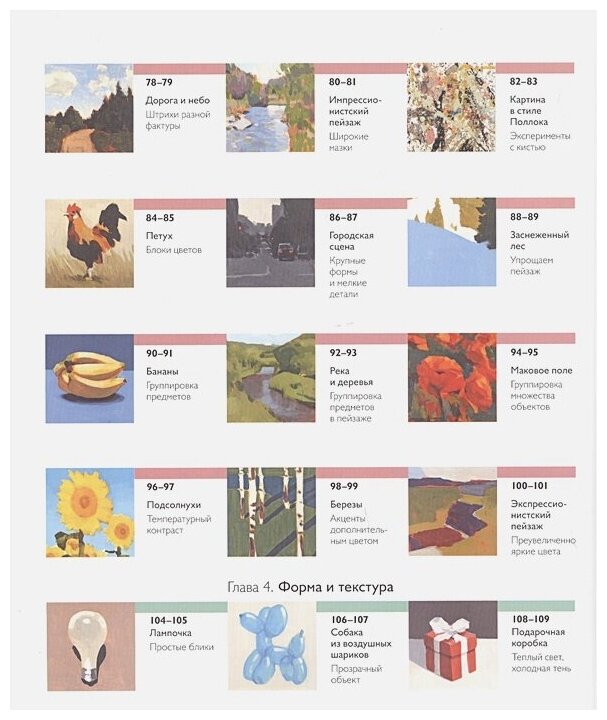 Каждая работа-урок сопровождается списком необходимых материалов, используемых пигментах, ставится задача урока. Другими словами это не 50 отдельных работ, а последовательный, хорошо спланированный курс живописи акрилом.