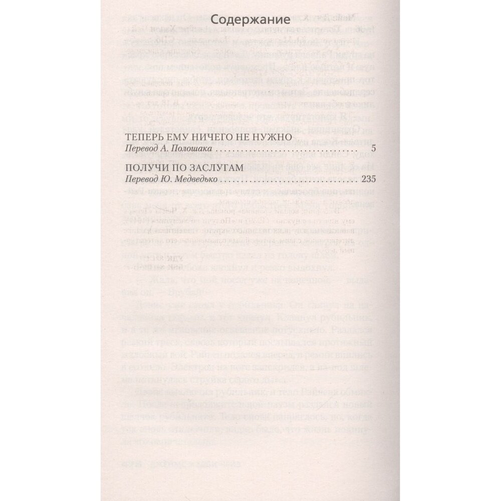 В сборник вошли «ранние» романы Дж. Х. Чейза «Теперь ему ничего не нужно» (1939) и «Получи по заслугам» (1941), написанные в лучших традициях «крутого детектива» на пике литературной славы, которой был ознаменован его литературный дебют.