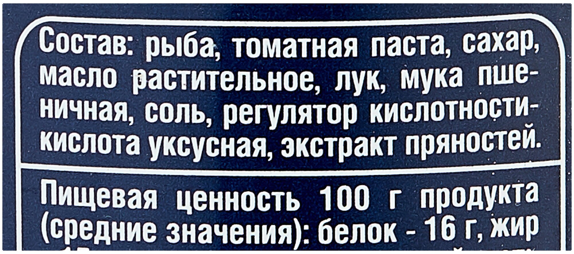 | Состав | рыба, томатная паста, сахар, масло растительное, лук, мука пшеничная, соль, регулятор кислотности-кислота уксусная, экстракт пряностей. |