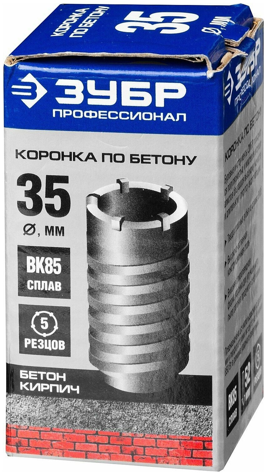 Коронка по бетону Зубр 29180-35 Ø 35 x 70 мм, HSS-R, быстрорежущая сталь М2(S6-5-2) Р6М5, класс А М22, 5T, без державки