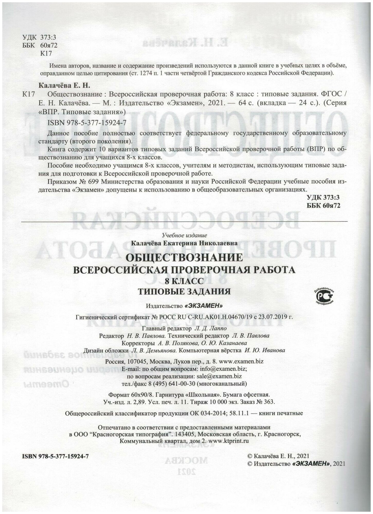 ВПР. Обществознание. 8 класс. Типовые задания. 10 вариантов. (Калачева Екатерина Николаевна); Экзамен, 2021