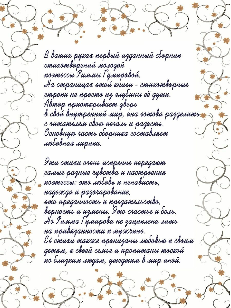 В ваших руках первый изданный сборник стихотворений молодой поэтессы Риммы Гумировой. На страницах этой книги - стихотворные строки не просто из глубины её души. Автор приоткрывает дверь в свой внутренний мир, она готова разделить с читателем свою печаль и радость. Основную часть сборника составляет любовная лирика.