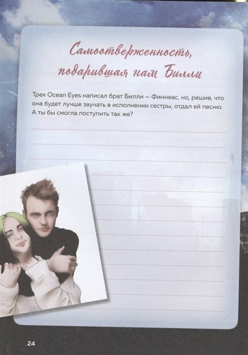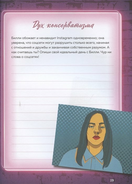 Интересные безобидные задания, которые помогают юным почитателям творчества Билли стать ближе к своему кумиру. Внутри задания из разряда "Нарисуй прическу", "Одень Билли", "Придумай хит". Что самое важное - фанбук направлен на повышение самооценки подростка, что особенно важно. На последних страницах фанбука размещено очень вдохновляющее послание, что для меня, как для мамы, особенно важно.