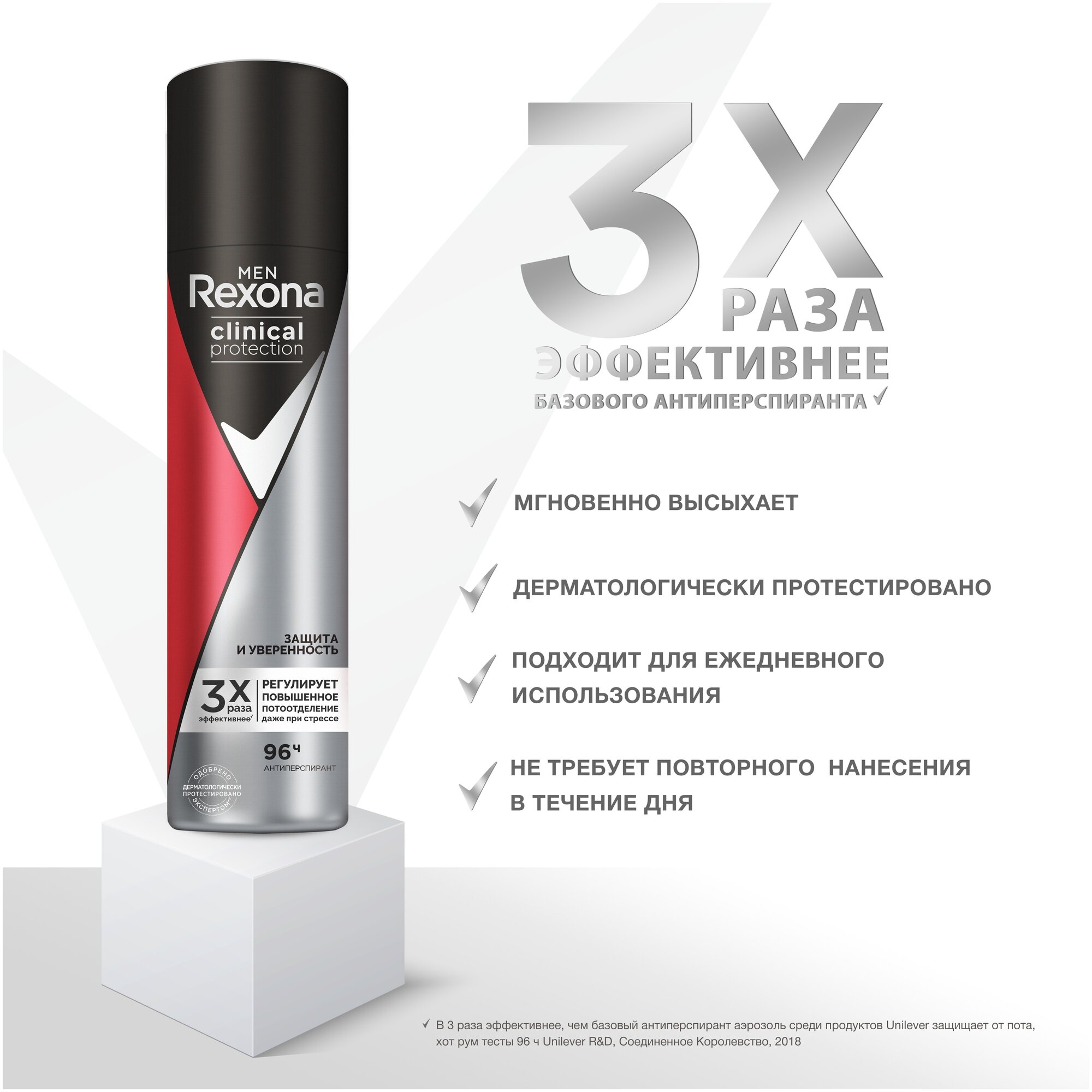 | Особенности | Мгновенно высыхает, не требует повторного нанесения в течение дня и подходит для ежедневного использования. В 3 раза эффективнее базового антиперспиранта. Попробовав раз, вы не захотите возвращаться обратно. Премиальное ощущение сухости и свежести. Обеспечивает длительную защиту от пота на 96 часов. |