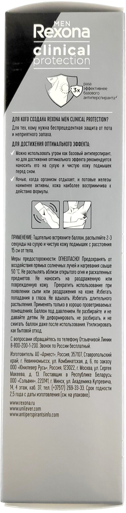 | Способ применения | Тщательно встряхните баллон, распыляйте 2-3 секунды на сухую и чистую кожу подмышек с расстояния 15 см от тела. ДЛЯ ДОСТИЖЕНИЯ ОПТИМАЛЬНОГО ЭФФЕКТА: Можно использовать утром как базовый антиперспирант, но для достижения оптимального эффекта рекомендуется наносить его на сухую и чистую кожу подмышек перед сном. Ночью, когда организм отдыхает, и потовые железы наименее активны, кожа наиболее восприимчива к действию формулы. |