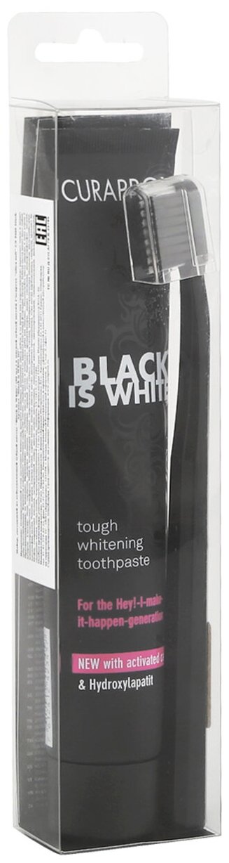 | Полное описание | Набор Black Is White. В набор входит отбеливающая паста и ультрамягкая щетка. Активированный уголь поглощает вещества, которые вызывают изменение цвета зубов, в то время как гидроксиапатит укрепляет эмаль и делает зубы белоснежными. Ферменты усиливают защитные свойства слюны. Двойная защита от кариеса благодаря фторидам натрия. Зубная паста имеет вкус лайма. |
