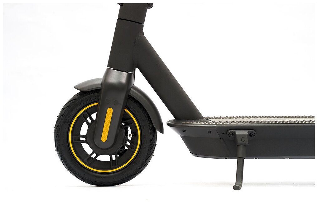 Пневматические бескамерные колеса диаметром 10-дюймов изготовлены из прочной самовосстанавливающейся резины с защитой от проколов, обеспечивая возможность безопасно перемещаться по неровным поверхностям. На самокате можно подниматься в гору с уклоном до 20 %.