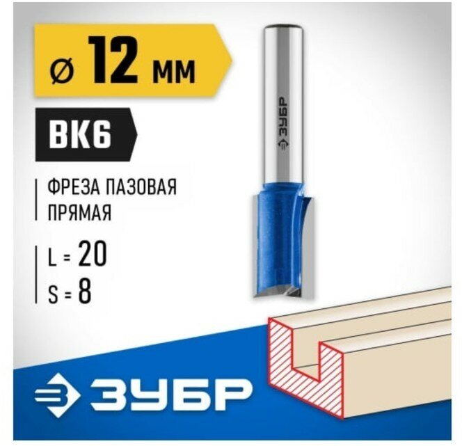 Пазовая прямая фреза ЗУБР Ф12мм s8мм i19мм (28755-12-19)