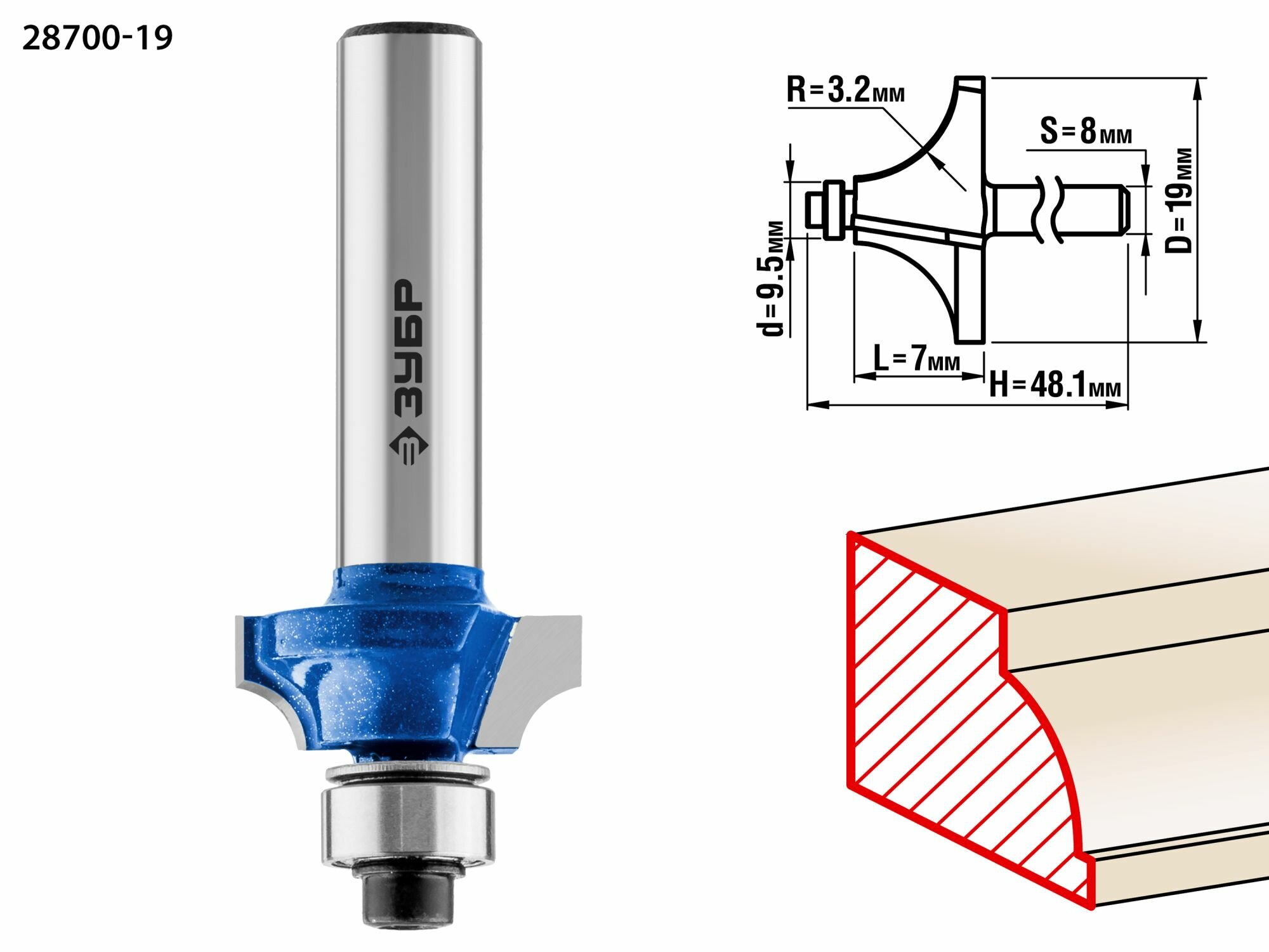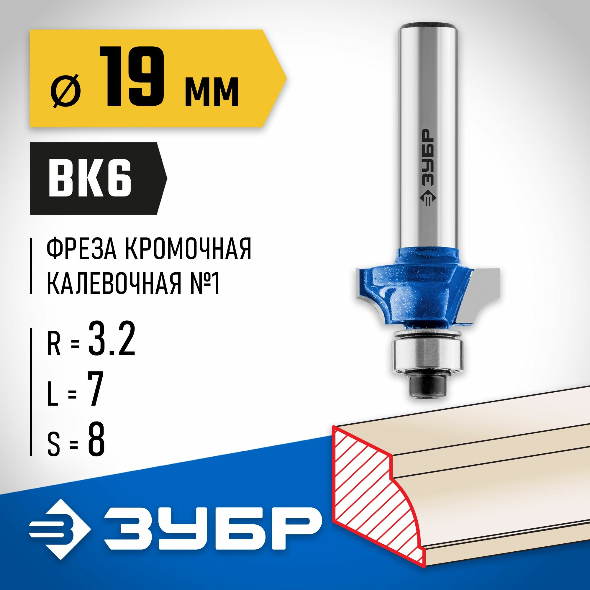 Фреза кромочная калевочная №1, D= 19мм, рабочая длина-7мм, радиус-3,2мм, хв.-8мм, d-9,5 мм, ЗУБР Профессионал