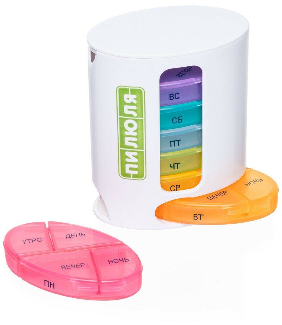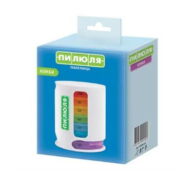 Таблетницы предназначены для компактного и упорядоченного хранения лекарственных средств или витаминов. Универсальная таблетница пилюля комби разработана специально для активных людей, которым необходимо принимать лекарства несколько раз в течение недели или дольше, как дома, так и в дороге. Способ применения: Открыть крышки отделений; разложить витамины или лекарства по отделениям; закрыть крышки. Меры предосторожности: Перед использованием промыть таблетницу теплой водой с мылом и высушить ее.