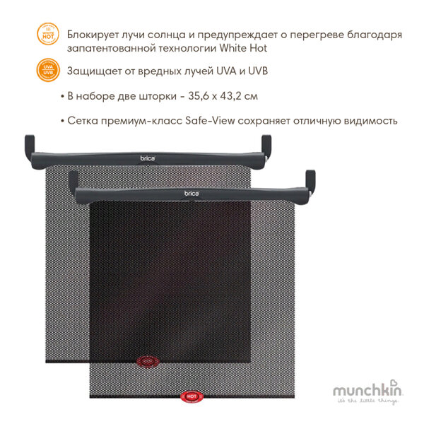 Brica munchkin солнцезащитные шторки White Hot® Sun Safety™ Shades 2 шт. Простая в использовании солнцезащитная шторка для окон автомобилей блокирует лучи солнца и предупреждает о перегреве благодаря запатентованной технологии White Hot. Индикатор становится белым, когда фиксирует перегрев внутри автомобиля. Особенности: роликовая шторка блокирует солнечные лучи индикатор White Hot cтановится белым при перегреве автомобиля двойная система крепления, регулируемые зажимы и присоски позволяют идеально подогнать шторку под окно автомобиля специальная кнопка для быстрого сворачивания шторки сетка премиум-класс Safe-View сохраняет отличную видимость защищает от вредных лучей UVA и UVB в наборе две шторки размер каждой шторки - 35,6 х 43,2 см