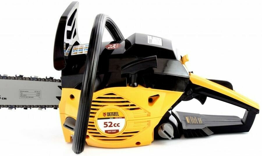 | Прочие особенности и свойства | Мощный и экономичный двигатель Denzel серии Garden Line, Надежный механизм сцепления, Свеча зажигания Bosch, Антивибрационная система, Тормоз цепи, Помпа подкачки топлива (праймер), Быстрый доступ к воздушному фильтру и свече зажигания, Блокировка от случайного запуска, Регулируемая система смазки цепи, Стальной зубчатый упор |