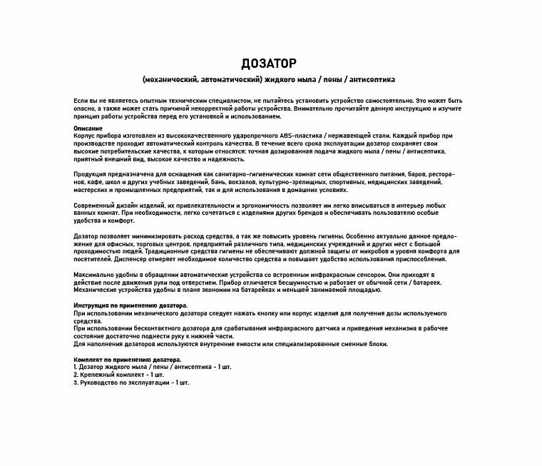 Механический дозатор для жидкого мыла предназначен для установки в любых санитарно-гигиенических комнатах. Имеет ключ и пластиковый замок. Дозатор прост в эксплуатации, достаточно нажать на кнопку для получения порции средства. Для удобства контроля за уровнем мыла на лицевой поверхности есть смотровое окно в виде капли. Корпус диспенсера изготовлен из прочного пластика АБС белого цвета, который выдерживает различные механическое воздействие. В резервуар емкостью 350 мл можно заливать как жидкое мыло, так и прочие средства. Разместив диспенсер на стене, достаточно время от времени проверять заполненность резервуара. Иного ухода он не требует, не нуждается в замене батареек. Это отличное решение как для частных владений, так и для гостиниц, кафе, столовых и прочих общественных мест. Габаритные размеры: высота 190 мм, ширина 80 мм, глубина 75 мм. Вес - 0,300 кг, объем - 0,00177 м3.