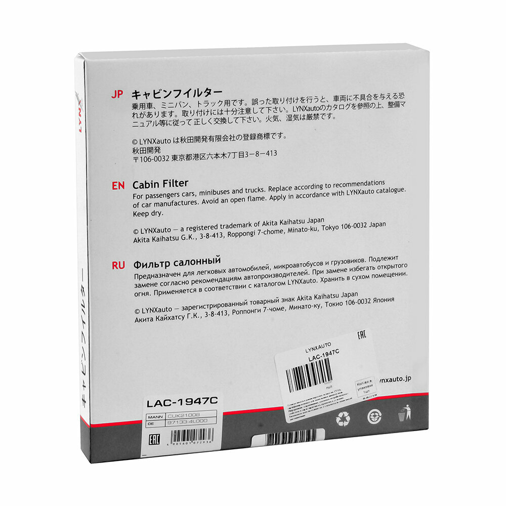 Фильтр салонный угольный LYNXauto . Фильтр салонный угольный LYNXauto KIA, Hyundai Solaris, Rio 3 LYNXauto В 2008 году японская компания Akita Kaihatsu запустило производство автозапчастей под маркой LYNXauto. В ассортименте LYNXauto более 17 000 наименований продукции для автомобилей японских, корейских и европейских производителей: тормозные колодки, фильтры, стеклоочистители, шрусы, ступицы и подшипники ступиц, ремни, компоненты привода ремня, лампы, высоковольтные провода, амортизаторы, защитные комплекты амортизаторов, тормозные диски, детали подвески и рулевого управления. OEM KC6113C, 49384604, AG435CFC, CAC29080, SAK279, KC6113, 21HYH34, ADG02582, 1987435014, K1329, FAAHY34, 21HY34, AC9328, ECF00010M, CU21008, N1340522, CA29080, WP2102, 971334L000, S971334L000.