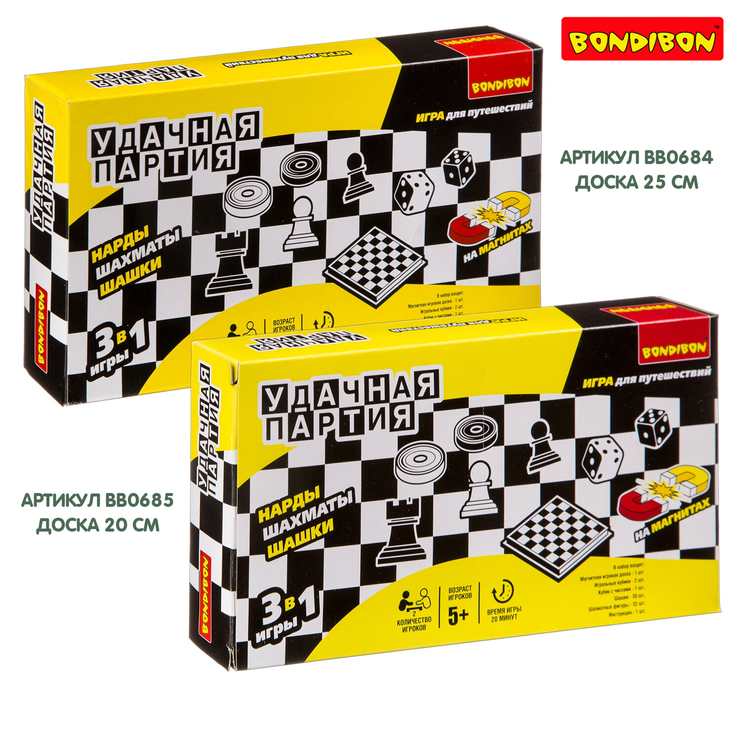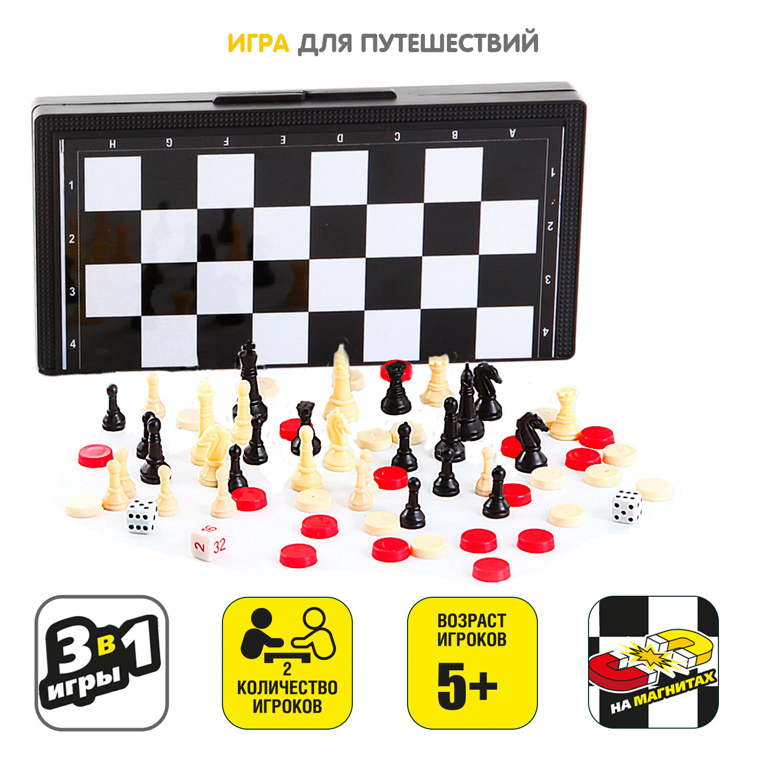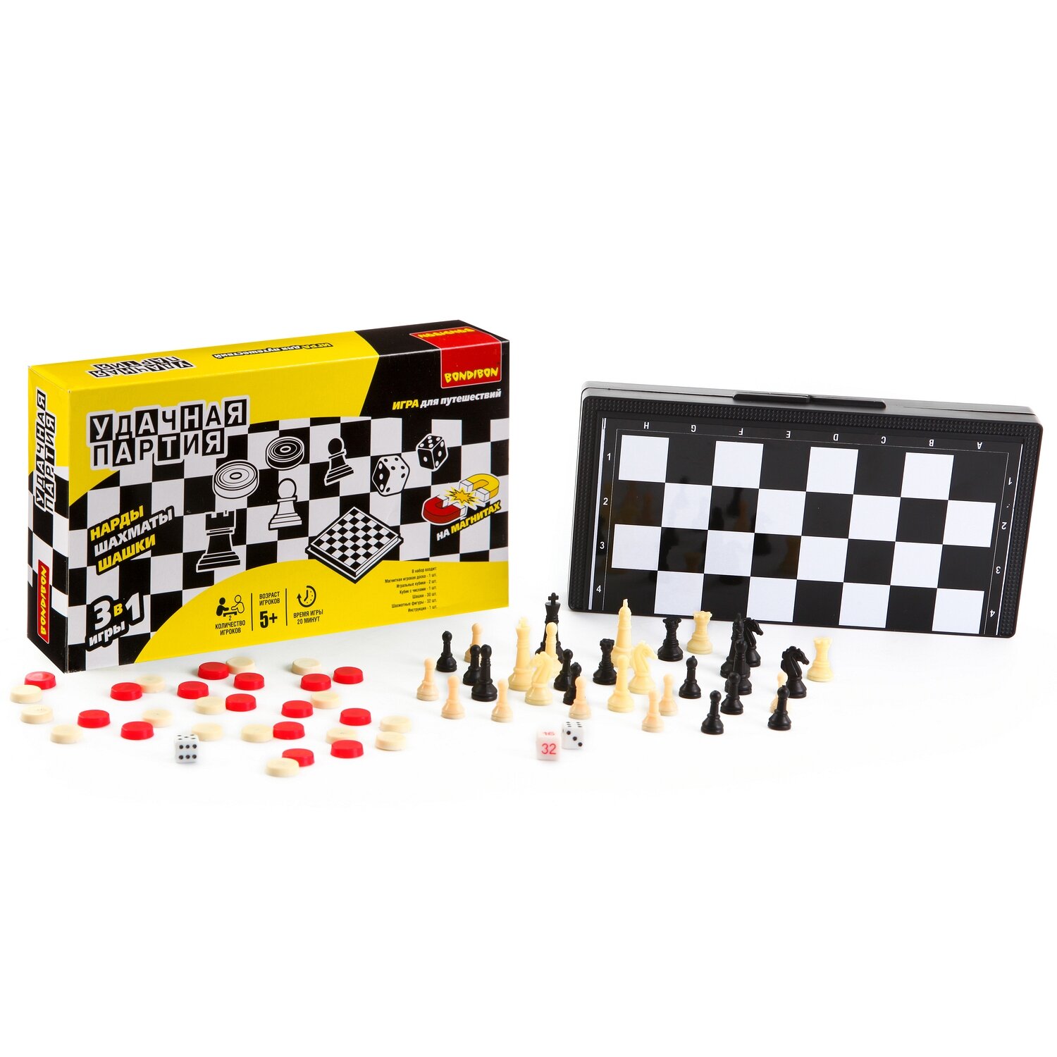 Удачная партия 3в1 25см. Нарды, Шашки, Шахматы . Вы не знаете, как скоротать длинную дорогу в поезде, что взять с собой на пляж, чтобы не грустить одиноко или как скоротать вечер – другой в непогоду на даче? Отличный вариант – набор «Удачная партия» , в котором есть сразу несколько самых популярных настольных игр всех времен и народов – шахматы, шашки, нарды, карты или игра – бродилка. Есть шахматная доска, размер которой можно выбрать (в разных наборах он разный). А для удобства шашки, фишки и шахматные фигуры сделаны на магнитиках, не растеряете на свежем воздухе или в дороге. Вечные ценности в одном комплекте, это ли не мечта интеллектуала?