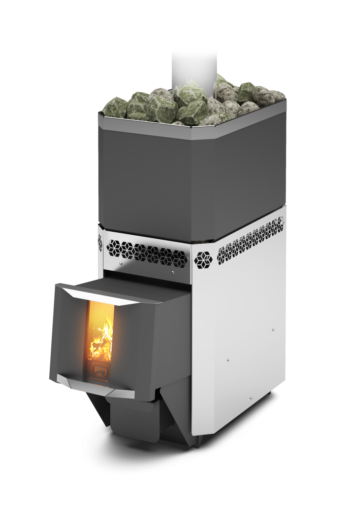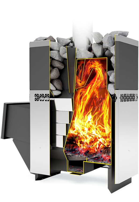 В корзине каменки камни выкладываются вокруг самого раскалённого элемента – дымосборника, - это обеспечивает качественный и равномерный прогрев камней.Выход дымовой трубы смещен от края к центру каменки. Это значительно упрощает монтаж дымохода и делает его безопаснее.Особая конструкция нагревательных поверхностей обеспечивает умеренный нагрев парной до 90°С, в сочетании с отличным прогревом большой массы камней печь позволяет получить микроклимат настоящей русской бани.Печь удобно топить из парной.